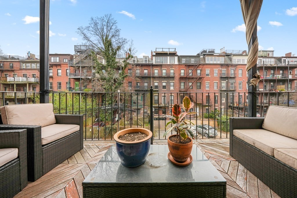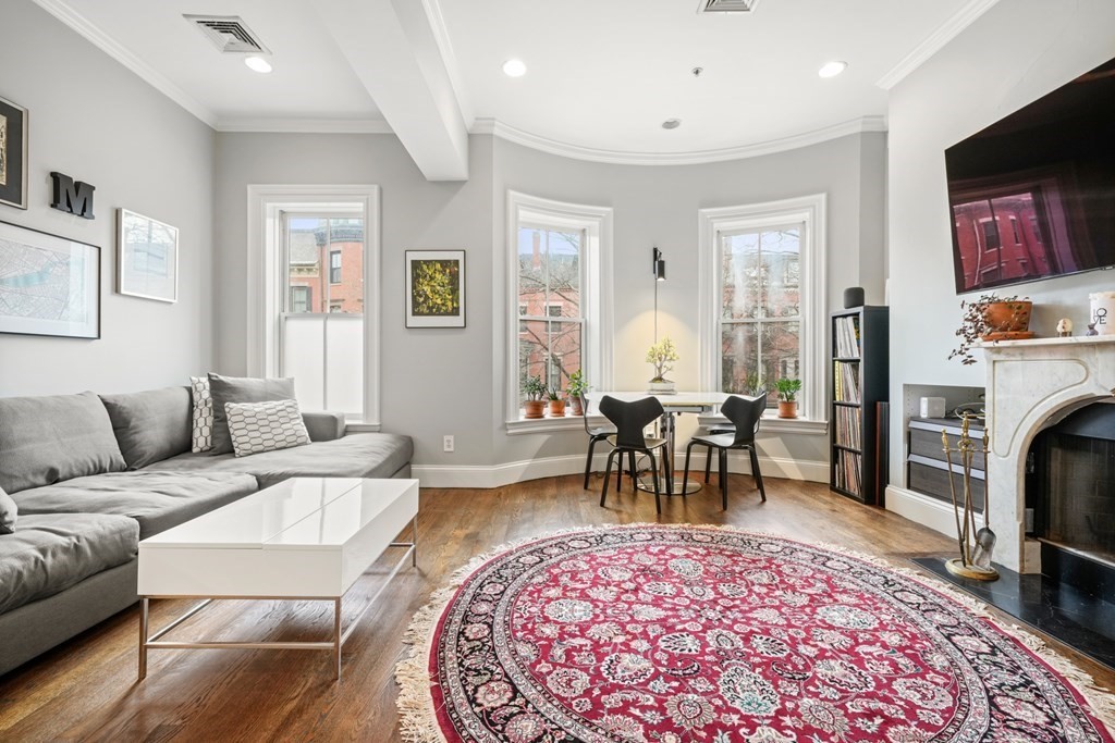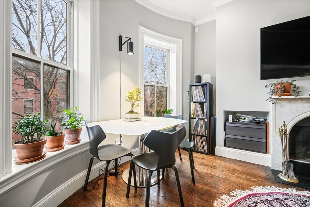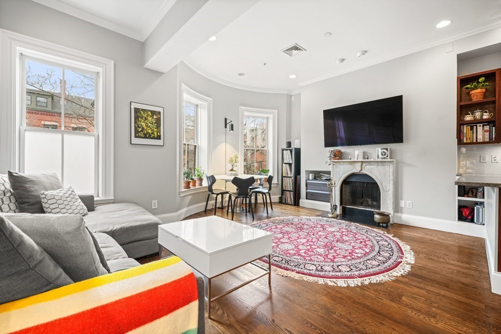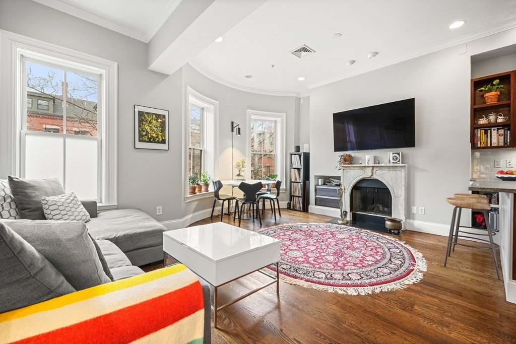 South End 2 bed floor thru with all the bells and whistles only 1 flight from the sidewalk. Full building width living and dining areas with high ceilings and 3 large windows over looking charming West Concord Street. Crisp kitchen with Sub-zero fridge offers counter seating and gas cooking. Wood burning fireplace with marble surround is perfect for cold winter days. Lux bath w/walk-in glass shower, custom vanity & striking stone tile. Large sunny deck for outdoor living and tandem parking space! Central AC, washer/dryer, generous closets/storage, crown molding and beautiful hardwood floors through out. Only a few blocks to dog parks, Flour, Toro, Silver Line & more!