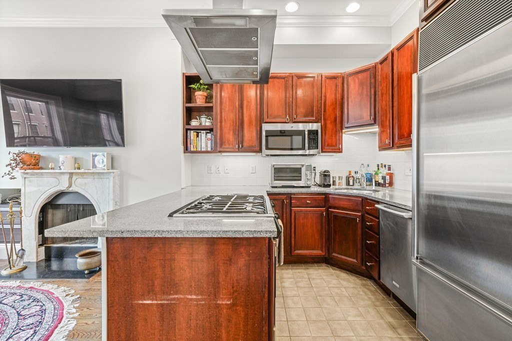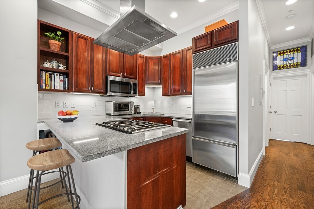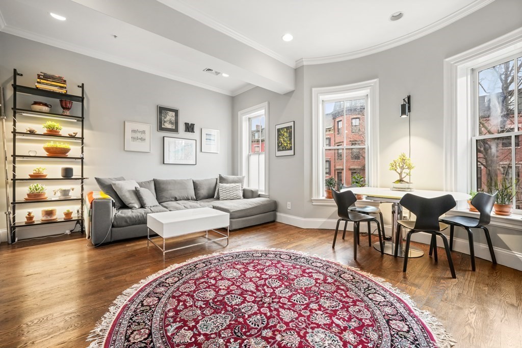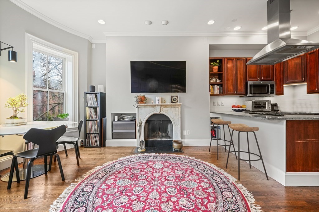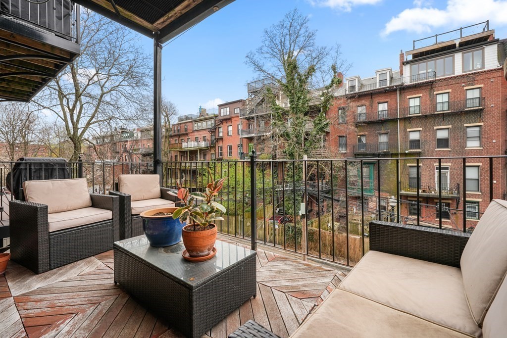 South End 2 bed floor thru with all the bells and whistles only 1 flight from the sidewalk. Full building width living and dining areas with high ceilings and 3 large windows over looking charming West Concord Street. Crisp kitchen with Sub-zero fridge offers counter seating and gas cooking. Wood burning fireplace with marble surround is perfect for cold winter days. Lux bath w/walk-in glass shower, custom vanity & striking stone tile. Large sunny deck for outdoor living and tandem parking space! Central AC, washer/dryer, generous closets/storage, crown molding and beautiful hardwood floors through out. Only a few blocks to dog parks, Flour, Toro, Silver Line & more!